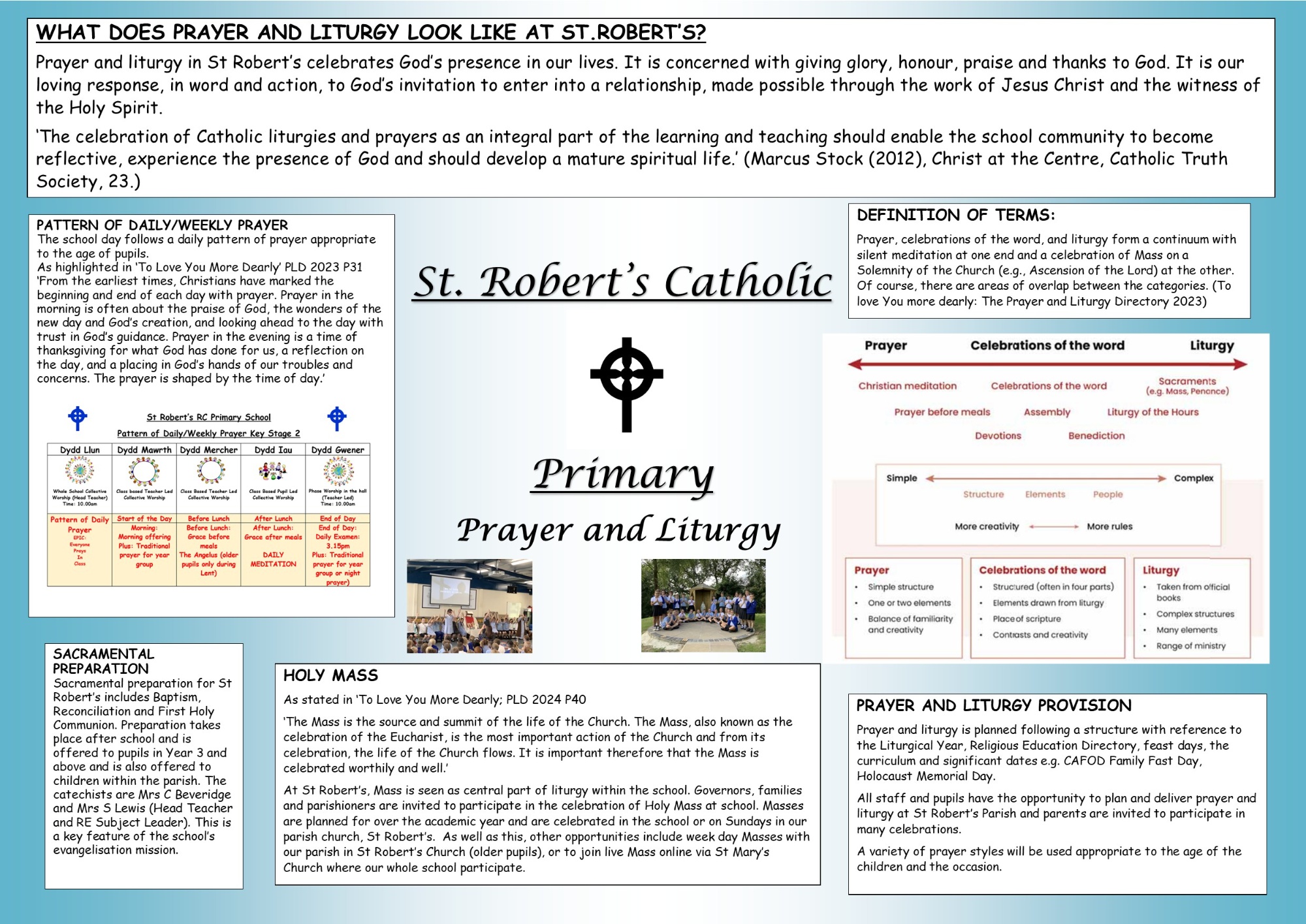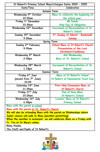 Masses are also planned and celebrated in school (whole school and class Masses), and Feast days are often celebrated as a whole-school Mass when possible, depending on the availability of a Priest to say Mass. Parishioners and parents are very welcome at these Masses.