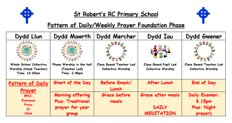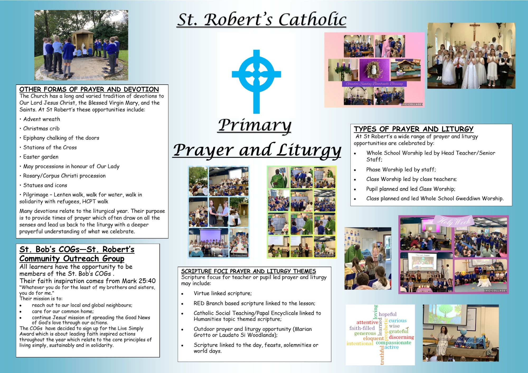At St Robert’s we aim to promote the spiritual development of all members of the school community and experience, and celebrate shared values. Alongside our weekly Headteacher Worships and Phase worships we hold regular class led whole school worships. These include our virtues, Harvest, Remembrance Sunday, Holy Week, special feast days and liturgical events e.g. Crowning of the May Queen.